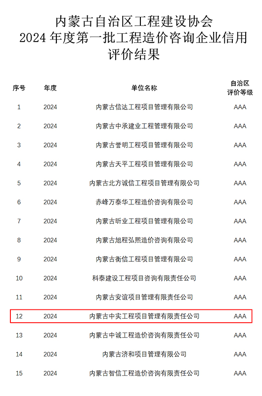 2024-07-3016809 次近期,我公司参加内蒙古自治区工程建设协会组织的“2024年度第一批工程造价咨询企业信用”申报,获得“信用AAA级证书”。我公司成立多年以来,遵循中国工程造价管理协会对造价咨询企…